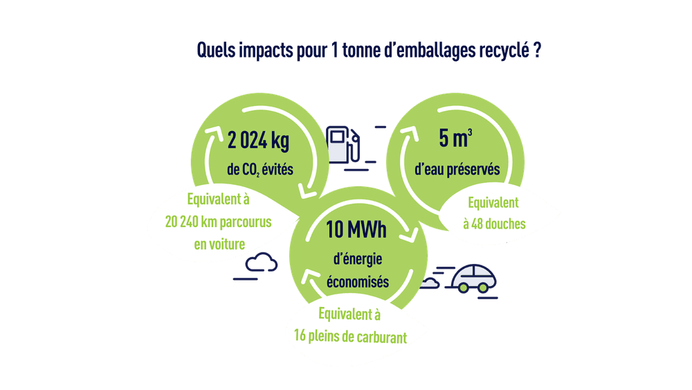 • 1 tonne d'emballages en mélange recyclés, c'est : 2 tonnes d'émissions de CO2 évitées, 8,5 MWh d'énergie et 4 500 l d'eau économisées