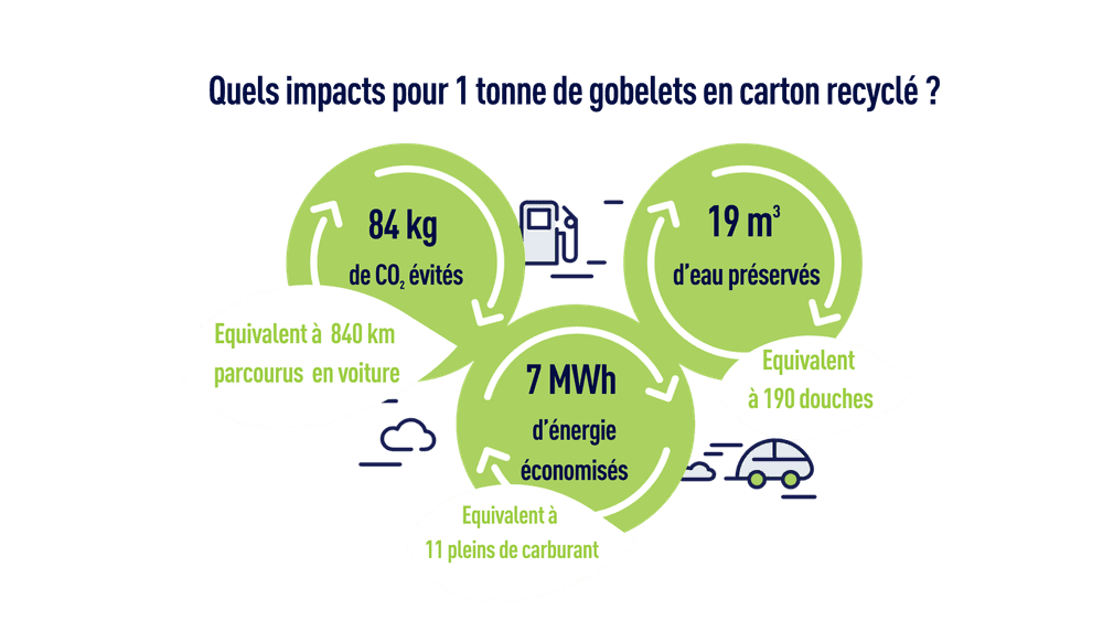 • 1 tonne de carton recyclée : 84 kg d'émissions de CO2 évitées, 6,7 MWh d'énergie et 19 m3 d'eau économisées